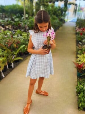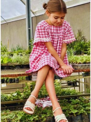 VESTIDO PECI algodão babados, saia pregas xadrez rosa e branco
