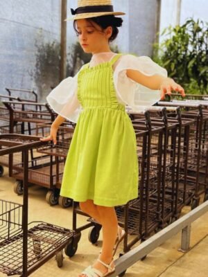 Jardineira Zínia Linho babados saia franzida verde claro