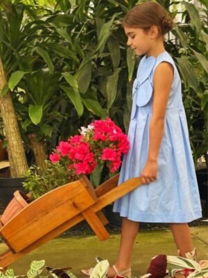 Vestido Íris algodão com maxi flor e saia de pregas azul claro