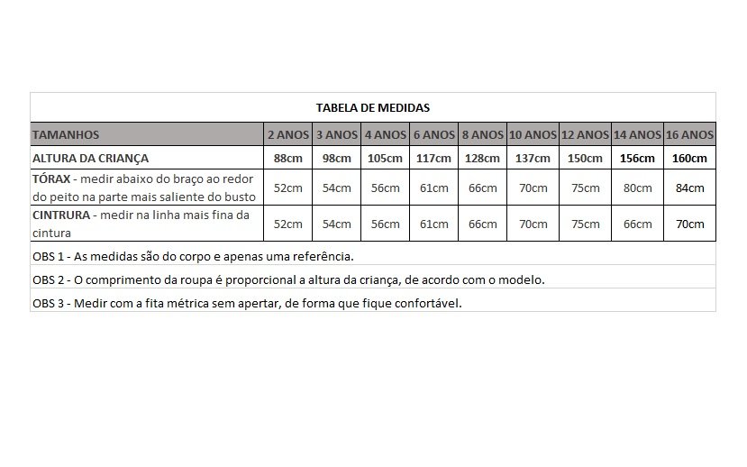 OBS 2 - O comprimento da roupa é proporcional a altura da criança, de acordo com o modelo.
